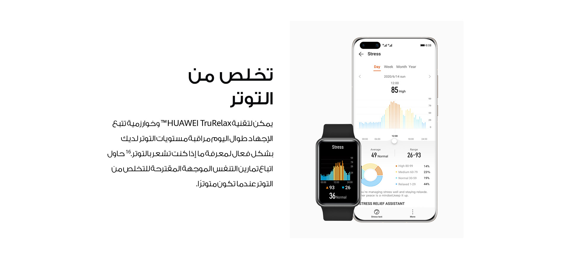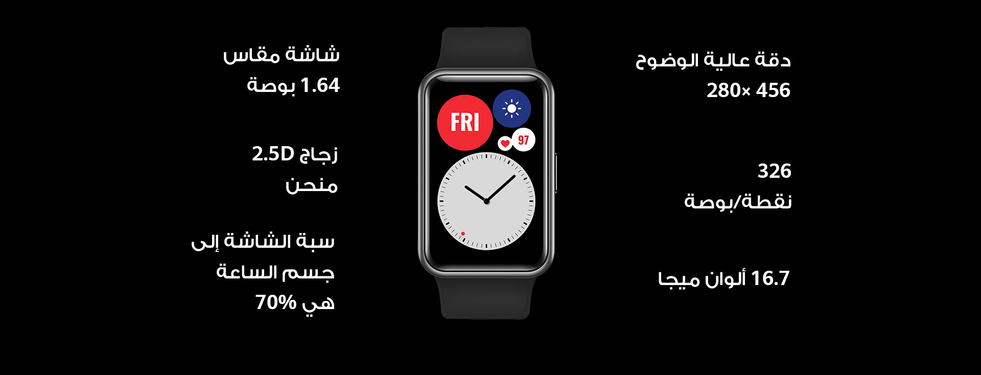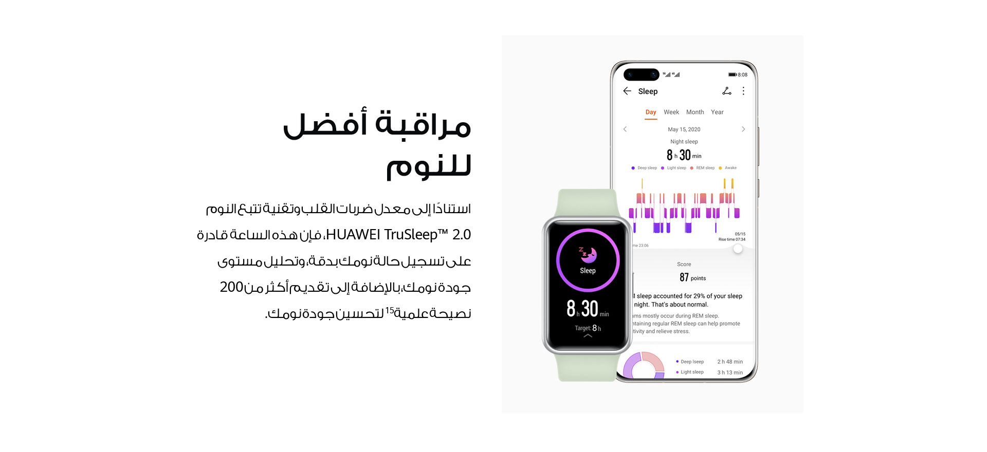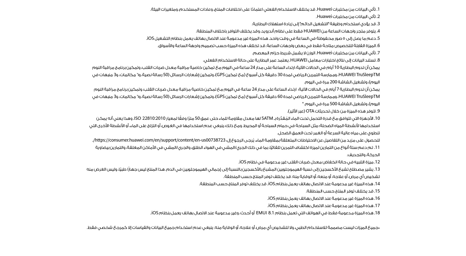 ميزة HUAWEI TruSleep™ ممكّنة، ميزة مراقبة معدل ضربات القلب ممكّنة. يتم فحص الشاشة لفترة وجيزة 500 مرة في اليوم، ويتم التذكير بورود 50 رسالة، و3 مكالمات، و3 تنبيهات خلال 24 ساعة، وممارسة التمارين لمدة 60 دقيقة في الأسبوع.