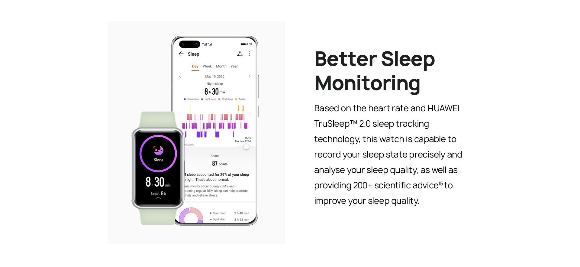 HUAWEI TruSleep™ is enabled, heart rate monitoring is enabled. Screen is checked briefly 200 times per day, 50 messages, 3 calls and 3 alarms reminding in 24 hours, and workout for 30 minutes per week.